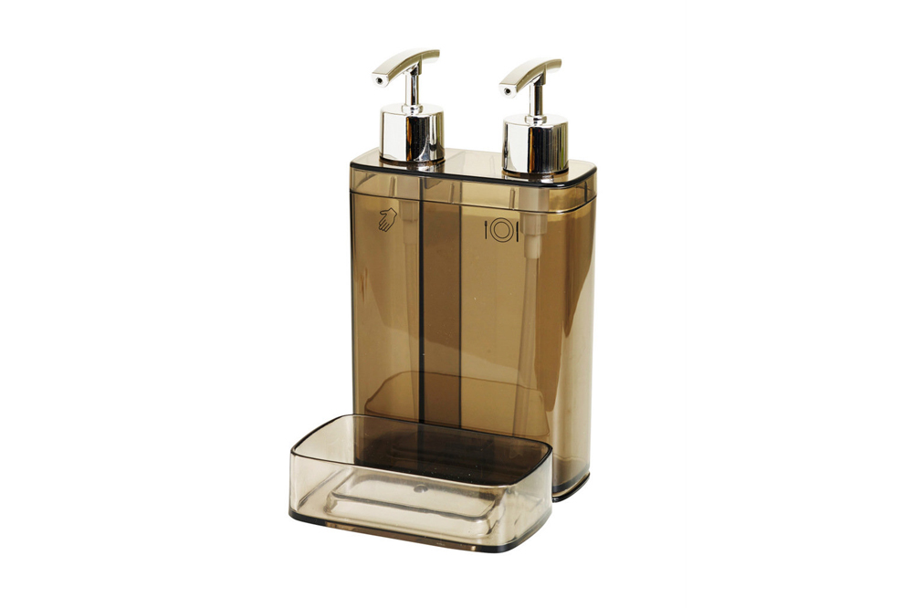 Кухонный дозатор пластиковый двойной, объём 0,3л и 0,6л, с контейнером для губки, размеры: 12,5*13,5*22 см" прозрачно-натуральный 650,33
